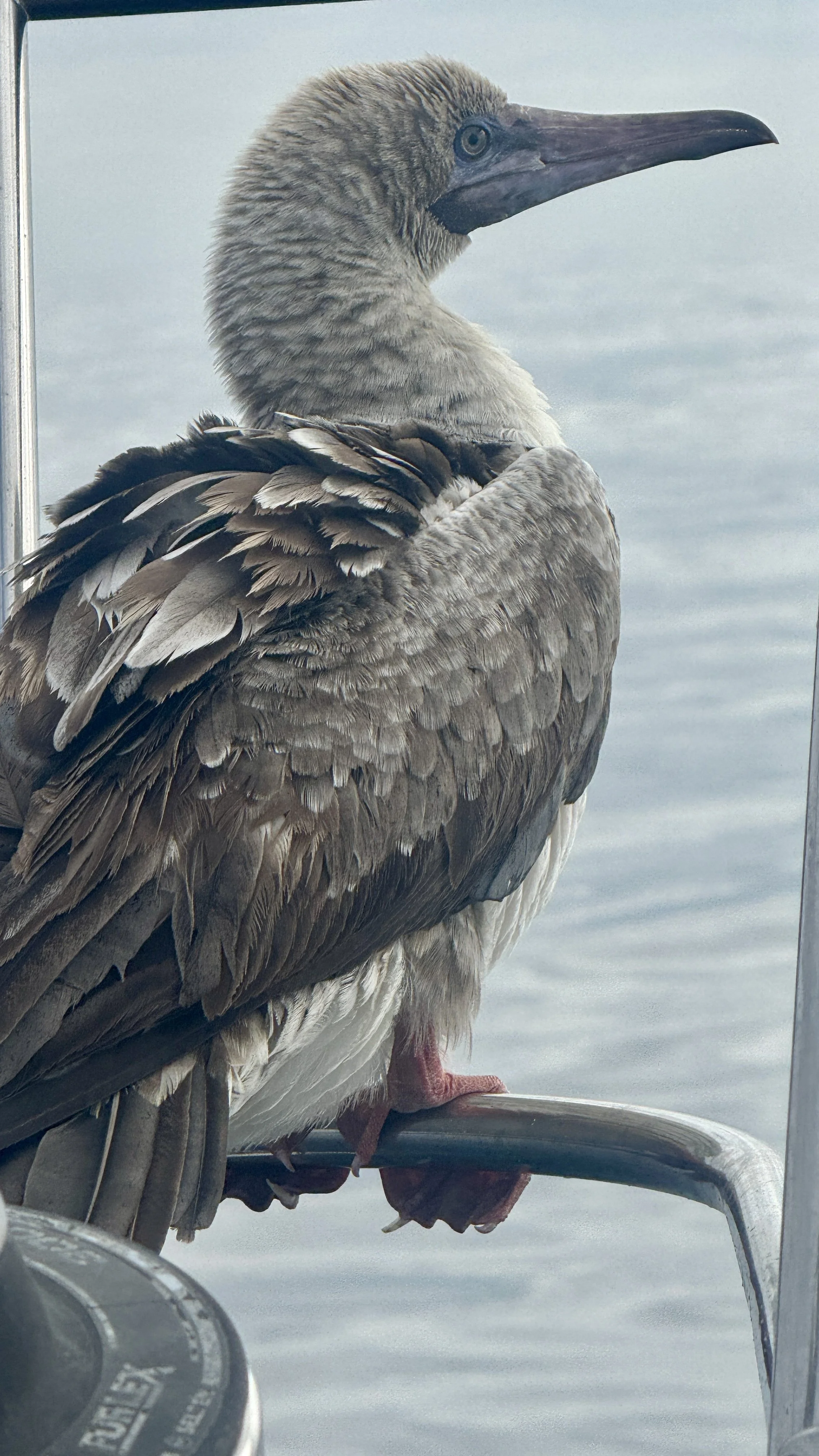 That afternoon, a strange thing happened. A fairly large bird landed, and that is generous way of describing what looked like as ungraceful a crash landing as possible into our bow pulpit. I have given many land birds rides that have been blown out to sea, but never a sea bird like this aside from a Sooty Petrel in forest fire smoke at night. The other strange thing was I couldn’t identify it. This strange bird sat on the pulpit for maybe as long as 10 hours. This was enough time using our Starlink to ask around and look at pictures online to get an ID. I sent a picture to my sister who is quite a birder and who lives in Estonia and she said it was an immature Red Footed Boobie. This couldn't be because we were way out of its habitat. Well thats what it was, and in our research, a friend of Chelsea’s, suggested that we could submit it to a bird watching site in Oregon and perhaps win bird of the month because of the rarity of the sighting.