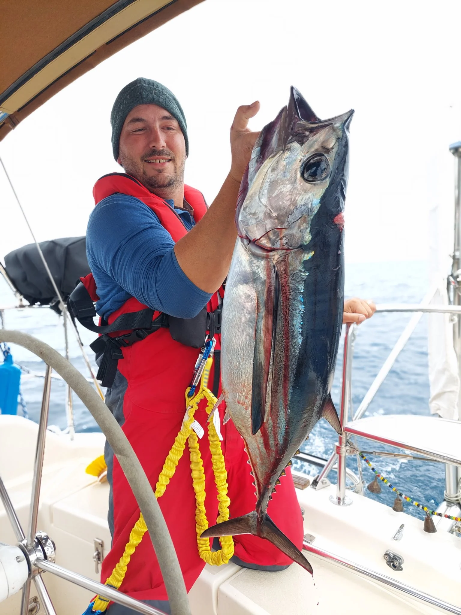 And the fish I've been praying for is in the boat. The only person not excited is Jesse. This is understandable because fish, especially tuna, have a fishy smell, and the only thing worse than diesel exhaust for someone teetering on the edge of puking their guts out is fishy smells.