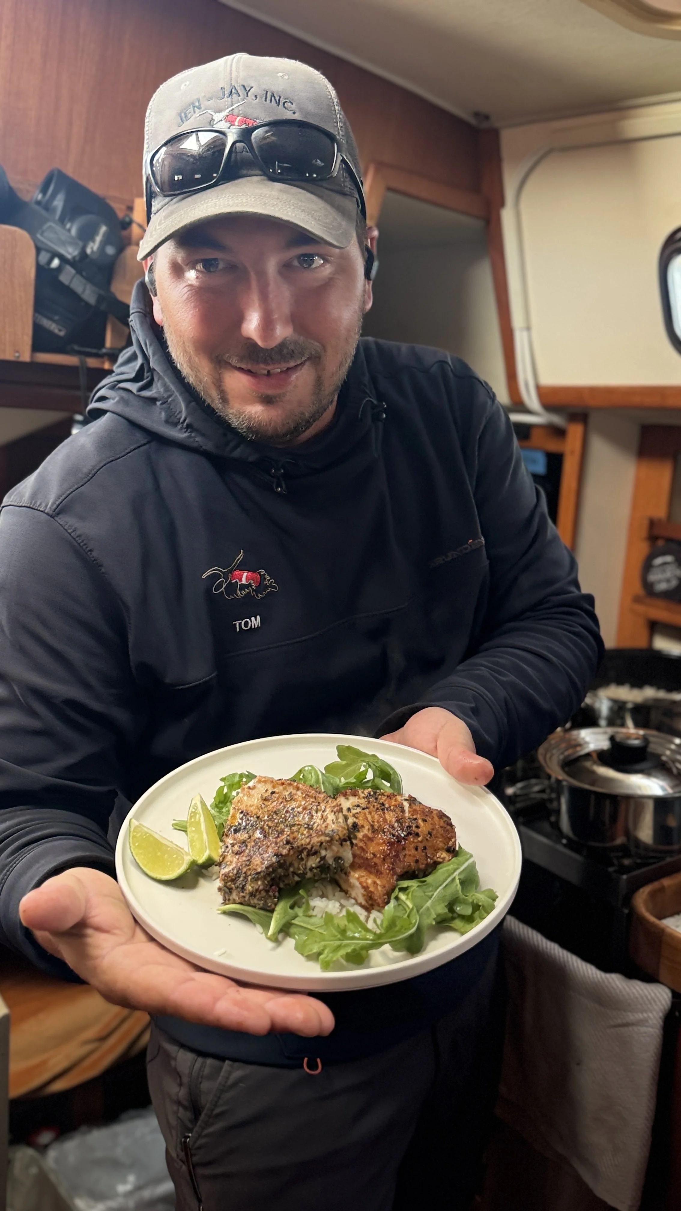 Tom thought we ought to increase our chances with another line, and right after he put his line in my line, hooked a fish, then as I pulled it in, bang, Tom had one too! Unfortunately, my fish got off, and as he was pulling his fish in, I asked Chelsea if they had a bonker, and was blown away to be passed a brand new gaff! I got the fish in the cockpit and said my thanks, and we got about bleeding and cutting the fish into steaks. The only downside was that the fridge was full, and we were down one eater, so we had to cook some right away. Everyone got a chance to try their tuna recipes eventually, but Tom, who cooked first, blew everyone away right out the gate, and we had a wonderful lunch. Seasoned blackened tuna on rice and arugula. Did I mention Tom used to own a restaurant and is a chef?