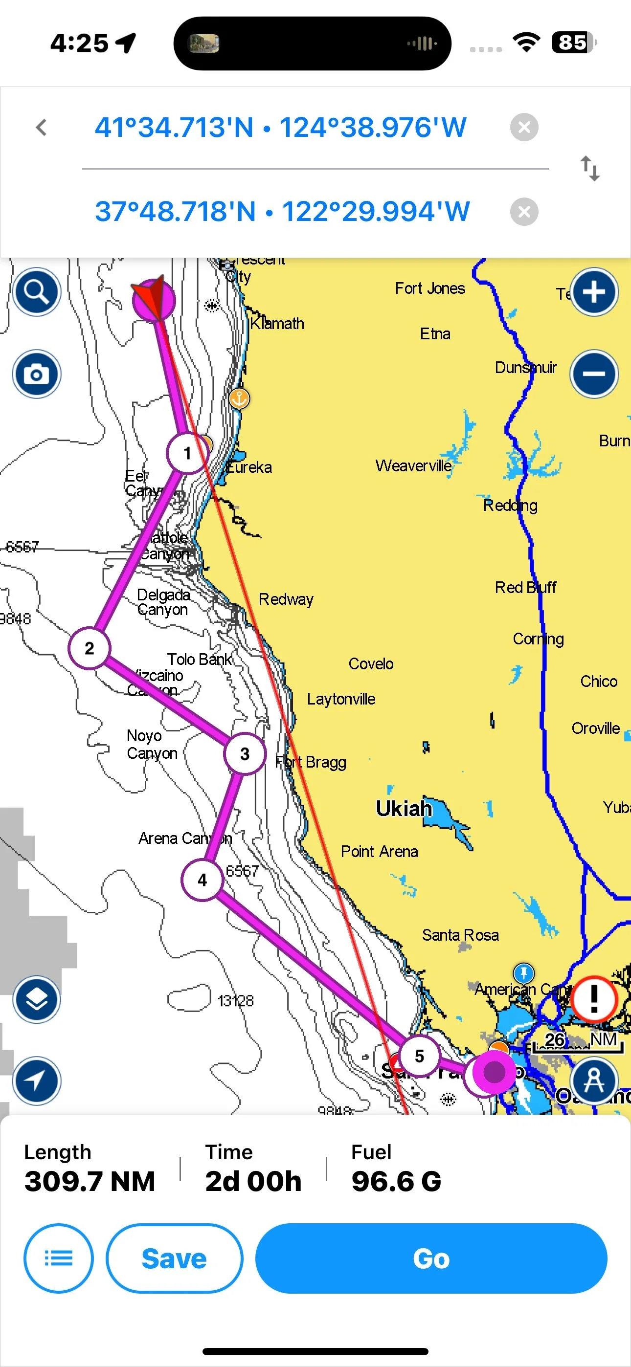 Looks like 20 plus NNW by midnight for rounding Cape Mendocino. Headed straight for Eureka to set up the broad reach out and be ready for the 25 knots there, but nothing but rolling so far.